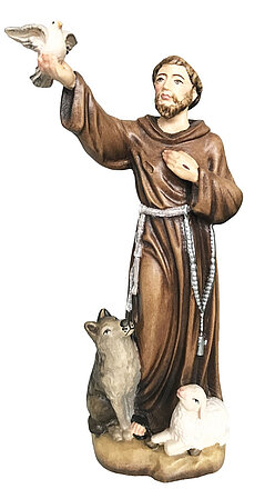Statue Heiliger Franziskus von Assisi mit Taube, Wolf und Lamm Heiligenfigur Holzfigur Holzstatue Maße ca.: , Höhe 20 cm. Gewicht: 0,6 kg. Material: handgeschnitzt und handbemalt aus hochwertigem Ahornholz. Herstellung: , erfolgt in einen traditionsreichem Unternehmen in Grödnertal, Südtirol. Das Grödnertal in Südtirol ist berühmt für seine hochwertigen Holzfiguren und seine jahrhundertealte Tradition der Holzschnitzer. Franziskus von Assisi wird in der römisch-katholischen Kirche als Heiliger verehrt. Er lebte nach dem Vorbild Jesu Christ. Dadurch zog er Gleichgesinnte an und gründete die "Minderen Brüder". Später war er Mitbegründer der Klarissen.