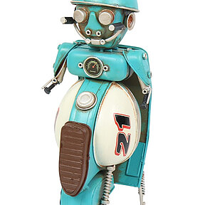 Retro Roboter H 28,5 cm Blechmodell Dekofigur in Türkis Vintage Metallkunst im 50er-Jahre Stil