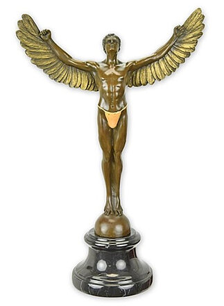 Detailreiche Bronzeskulptur Deko Skulptur Ikarus mit Flügeln offen stehend Griechische Mythologie für Innen- und Außenbereiche. Die hochwertige Bronzeskulptur eignet sich somit perfekt für jedes stilsichere Büro oder zu Hause. Maße ca.: , Höhe 41 cm x Breite 12.6 cm x Länge 27,1 cm. Gewicht ca.:  ,3,1 kg. Material:  ,aus hochwertiger Bronze im Bronzegussverfahren hergestellt. Sockel aus schwarzem Marmor. Da es sich um ein reines handwerkliches Produkt handelt, kann Farbton und Patina von den Fotos etwas abweichen.