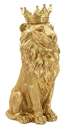 Produkt: Deko Skulptur Tierfigur Löwe mit Krone auf dem Kopf sitzend Löwenkönig Shanti in edler Goldoptik mit fein strukturiertem Fell. Shanti-Begriff in hinduistischer Religion bedeutet inneren Frieden, Ruhe, Glückseligkeit. Gefertigt aus hochwertigem Polyresin, bietet die Skulptur nicht nur ein edles Erscheinungsbild, sondern auch eine langlebige, detailreiche und robuste Verarbeitung. Die Statue ist frostsicher, sollte jedoch nicht starkem Regem und Sonneneinstrahlung ausgesetzt werden. Maße ca.:  ,Höhe 74 cm x Breite 30 cm x Tiefe 41 cm. Gewicht ca.:  ,6 kg. Material:  ,aus Polyresin: robust, langlebig, leicht, frostsicher. Ideale Dekoration für Innen- und geschützte Außenbereiche. Das Produkt strahlt innere Ruhe aus und schafft dadurch friedliche Atmosphäre. Die Produkte ,werden in einem traditionsreichen Unternehmen in handwerklicher detailgetreuer Arbeit hergestellt.