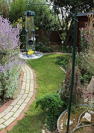 Naturschutzprodukt , Futtersäule "Big Easy" mit Stab, Spiarlhaken, Futterteller und Fülltrichter - stabiler Vogelfutterspender Mit der Schwegler Futtersäule mit Stab, Futterteller und Fülltrichter bieten Sie Wildvögel eine sichere und komfortable Futterstelle. Die hochwertige Futtersäule ist ideal für den Garten geeignet und sorgt das ganze Jahr über für eine artgerechte Fütterung heimischer Vogelarten. Sie haben keinen geeigneten Baum um Futtersäulen aufzuhängen? Mit dem 3-teiligen Stab erlaubt die freistehende Aufstellung unserer Futtersäulen. Der dreiteilige Stab wird zusammengesteckt und mit der Spitze in den Boden gedrückt. Mit dem beiliegenden Schraubadapter können die Futtersäulen und die Futterlampe auf dem Stab verschraubt werden. , Der transparente Futterbehälter ermöglicht eine einfache Kontrolle des Füllstands. Der großzügige Futterteller fängt herabfallendes Futter zuverlässig auf, reduziert Verluste und bietet zugleich wirksamen Schutz vor Madern und anderen unerwünschten Tieren. Die Ansitzstellen lassen sich durch Click-Prinzip ganz einfach abnehmen, sodass die Reinigung völlig problemlos ist. Lieferumfang:  ,Futtersäule inklusive sechs ansteckbaren Ansitz-Adaptern zum besseren Halt der Vögel, 3-teilige Stab, Spiralhaken, Futterteller und Fülltrichter. Futtersäule , Außenmaße:  , Höhe 50 cm x Durchmesser 8 cm, Gewicht 0,7 kg. , Inhalt:  ,2,2 l.  , Stab , Außenmaße:  ,Höhe 1,73 m x Durchmesser 2 cm. Gewicht 0,9 kg. Futterteller Maße: Durchmesser 28 cm x Gewicht 0,2 kg. Spiralhaken Maße: Länge ,40 cm x Gewicht 0,16 kg. Fülltrichter: Füllmenge 1,8 Liter. Material:  ,rostfreie Metallteile (grün beschichtet) mit UV-stabiler Polycarbonatröhre. Futter:  ,Sonnenblumenkerne und Futtermischungen für Säulen. , Kernerfresser:  ,Kohl-, Blau-, Sumpf-, Tannen- und Haubenmeise, Kleiber, Buch-, Grün- und Bergfink, Dompfaff, Erlenzeisig. Anwendung:  ,schnelle Reinigung, alle Einzelteile lassen sich ohne Werkzeug auseinandernehmen, dauerhafte Hygiene mit minimalstem Aufwand.