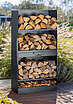 Produkt: Kaminholzregal "Vento" Holzregal für Kaminholz Kaminholzablage Kaminholzständer Maße ca.: , Höhe 150 cm x Breite 80 cm x Tiefe 30 cm. Gewicht ca.:  ,50 kg. Material: hochwertige Stahlprofile mit Pulverbeschichtung - wasserfest. HANDGEFERTIGTES PRODUKT, HERGESTELLT IN EUROPA Dieses stabile Kaminholzregal aus Stahl ist eine praktische Ergänzung zu den Gartenöfen VENTO. Das Regal verfügt über vier Holzablagen, von denen die kleinste zur Aufbewahrung von kleinem Anzündholz verwendet werden kann. Die Schublade hingegen eignet sich hervorragend zur Aufbewahrung von verschiedenen Anzündmitteln, Streichhölzern oder Zeitungen. Das Kaminholzregal VENTO ist für den Einsatz im Freien konzipiert. Das Regal wurde sorgfältig hergestellt und die einzelnen Elemente des Ständers wurden miteinander verschweißt, wodurch das Produkt sehr solide und stabil ist. Der VENTO Holzständer ist aus rohem Stahl gefertigt, was bedeutet, dass er eine andere Farbnuance haben kann als das Produkt auf den Fotos. Dies ist eine natürliche Eigenschaft von Stahl, hat jedoch keinen negativen Einfluss auf die Funktionalität und Haltbarkeit des Produkts. Der Artikel ist Sperrgut und wird auf der Palette angeliefert.