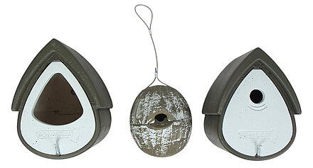 Produkt: Nisthöhlen Satz 3 Stück Nisthilfe Zaunkönigkugel 1ZA Nistkasten "Efeu"-grün, Halbhöhle 2MR grün, Meisenresidenz 1MR grün Set Eleganz - mit Charme und Artenschutz in Gärten. Mit diesem schönen Satz von Nisthöhlen gewähren Sie effektiven Schutz für die meisten kleinen Gartenvögel. 1ZA Zaunkönigkugel Fluglochweite: ca. 30 x 27 mm. Gesamtmaße: Kugeldurchmesser 18,5 cm. Länge der Aufhängung: ca. 20 cm. Gewicht: ca. 2,0 kg. Farbe: Efeu grün. 2MR Halbhöhle , Gesamtmaße: Breite , 19 cm x Höhe 27 cm x Tiefe 23 cm. , Gewicht:  ,ca. 5,2 kg. , Farbe:  ,grün. 1MR Meisenresidenz , Gesamtmaße: Fluglochweite: D 32 mm. Breite , 19 cm x Höhe 27 cm x Tiefe 23 cm. , Gewicht:  ,ca. 5,2 kg. , Farbe:  ,grün. Material: Holzbeton. Es ist ein Naturprodukt, besteht aus ca. 75 % Holz und klimaausgleichenden Zuschlägen, z.B. Ton, Lehm, etc. Eigenschaften: langlebig, witterungsbeständig, spechtsicher, atmungsaktiv, praxiserprobt. Bewohner: Zaunkönig, Meisen, Rotkehlchen, Hausrotschwanz, Bachstelze. Aufhängeplatz: die Auhängeschlaufe kann z.B. an einam Ast angebracht werden. Bevorzugte Bewegungsräume sind direkt im Gestrüpp, Schattenbereich. Produzent: Firma Schwegler ist seit 76 Jahren eine vertraute Marke für Vogelschutzgeräte und Naturschutzprodukte. Der große Erfolg und höchste Belegungsquoten sind wissenschaftlich belegt. Unzählige Empfehlungen von internationalen führenden Naturverbänden, staatlichen Einrichtungen, gemeinnützigen Organisationen untermauern die Qualität der Produkte.