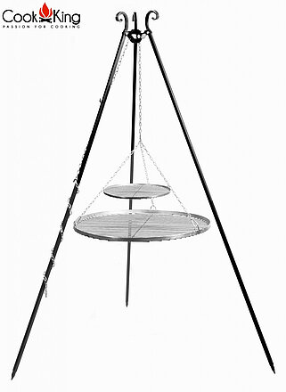 Produkt: , Schwenkgrill H 180 cm mit Doppelrost aus Rohstahl 40 cm + 70 cm Dreibein Grill Tripod Grillen , Maße ca.: , Höhe 180 cm x ,Durchmesser des Rostes Cook King: 40 cm + 70 cm ,x Dicke der Roststangen 5 mm x Gewicht 15 kg. Material: , Doppelrost ,aus rostfreiem Edelstahl, Dreibein aus pulverbeschichtetem Stahl In der Mitte faltbares Dreibein:  ,Die Beine des Dreibein sind in je 2 Einzelteile unterteilt und lassen sich zusammenstecken. Dank den in der Mitte faltbaren Beinen hat das Dreibein ein zusätzlichen Vorteile: Das Dreibein lässt sich schnell und einfach montieren, demontieren, transportieren und aufbewahren. HANDGEFERTIGTES PRODUKT, HERGESTELLT IN EUROPA Ein Schwenkgrill ist ein perfekt geeignet für Treffen mit Familie Freunden oder Bekannten im Garten. Bei diesem Grill kann sowohl ein gewöhnliches Feuer als auch traditionelles Kohlenbrikett als Wärmequelle verwendet werden. Das Dreibein ist pulverbeschichtet, was seine Wetterbeständigkeit erhöht. Der massive, aus dicken Materialien ausgefertigte Rost kann eine große Menge Essen halten. Das stabile Dreibein lässt den Gartengrill auf jeder, auch auf einer unebenen, Fläche aufstellen. Einfache Regulierung des Rostes ermöglicht eine schnelle Änderung dessen Höhe. , Einen Grill mit zwei Rosten zu haben, bringt mit sich viele Vorteile. Dank diesem Produkt gewinnen Sie eine größere Grillfläche. Eine weitere Option besteht darin, dass Sie auf dem kleineren Rost Speisen grillen können, die niedrigerer Temperatur bedürfen, oder Sie können darauf fertige Speisen abstellen, damit sie nicht abkühlen.