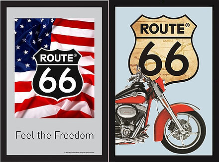 Set 2 Spiegelbilder Route 66 USA Flagge &, Motorrad Deko Bild Nostalgie Wandbilder , Die Spiegelbilder sind austauschbar! Nennen Sie uns einfach per e-Mail Details mit Bild und Artikel-Nummer zu Ihrem gewünschten Satz. Lizensierte Spiegelbilder in erstklassigem Hinterglasdruck. , Material:  ,Spiegelglas und Kunststoffprofilrahmen mit integriertem Aufhänger, in farbig bedrucktem Display-Karton, mit sichbarem Motiv. Maße:  ,Höhe 30 x Breite 20 cm x Tiefe 0,8 cm. Herstellung:  ,Europa EU-Raum. Die Produkte werden in einem traditionsreichen Unternehmen in handwerklicher detailgetreuer Arbeit produziert.