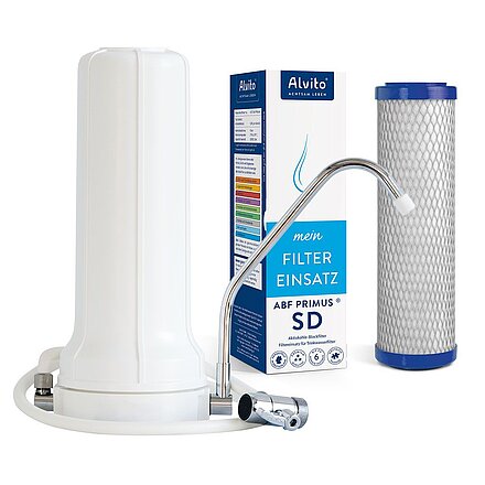 Alvito Auftisch Wasserfilter Basic im Startset inkl. Filtereinsatz ABF Primus SD zum sehr günstigen Preis. Der Auftischfilter wird ganz einfach vorne an Ihrem Wasserhahn angeschlossen, nun wird nur...
