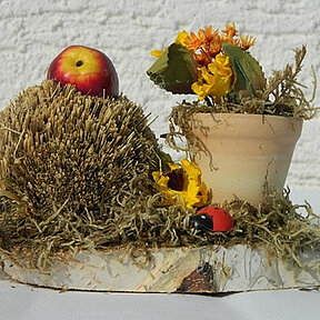 Deko Heu Figur Igel auf Birkescheibe mit Töpfchen dekoriert aus Naturmaterial Heudeko Basteln