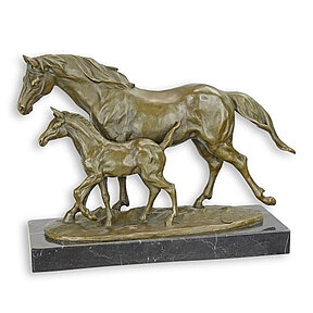 Bronzefigur Bronzeskulptur Bronze mit Fohlen trabend Pferd auf Sockel Höhe 22,9 cm Bronze Figur